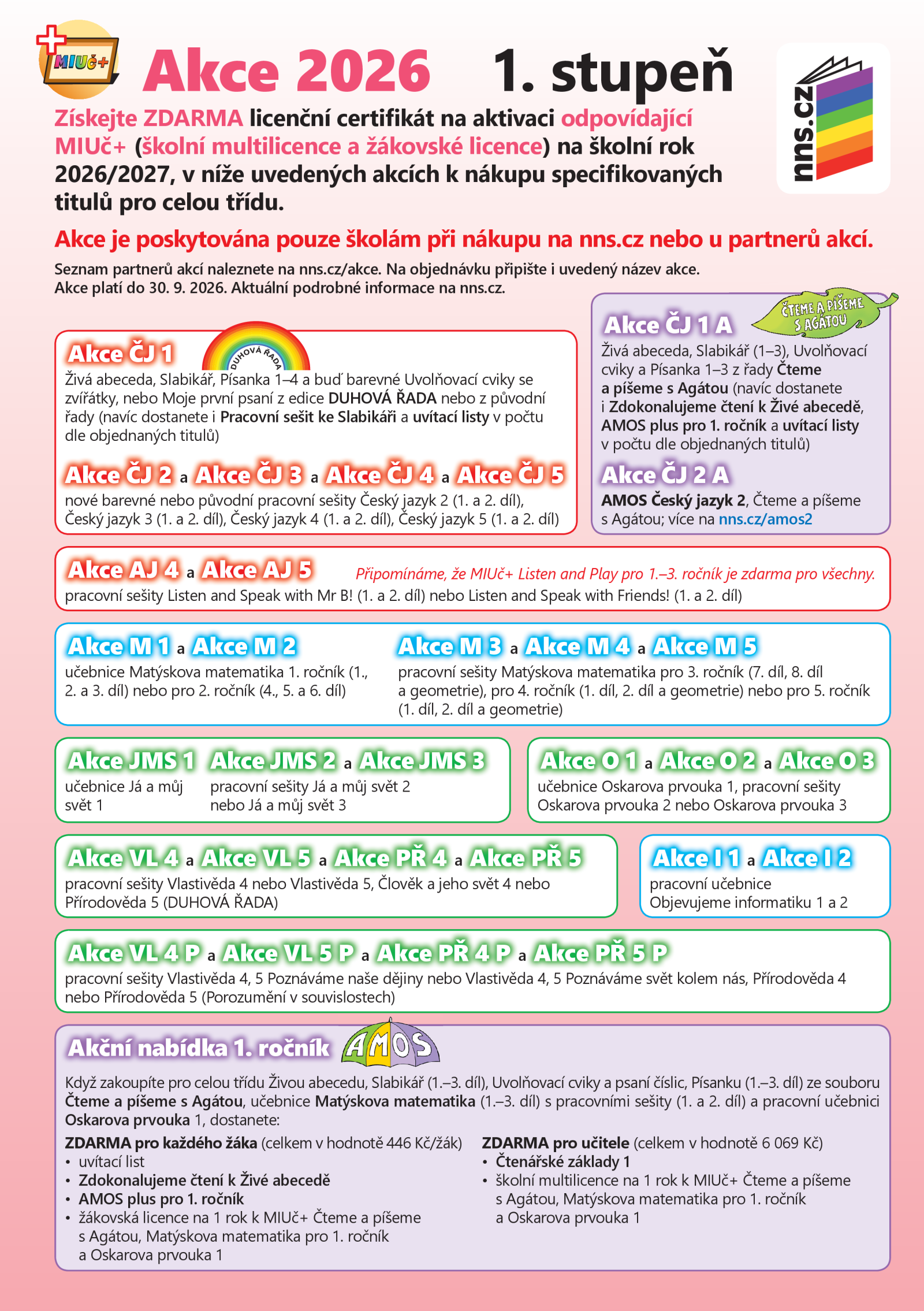 Při zakoupení vybraných tištěných titulů pro Český jazyk, Matematiku, Prvouku, Přírodovědu, Vlastivědu, Hudební výchovu a Informatiku pro celou třídu získáte ZDARMA licenční certifikát na aktivaci odpovídající MIUč+ (školní multilicence a žákovské licence) na školní rok 2026/2027.