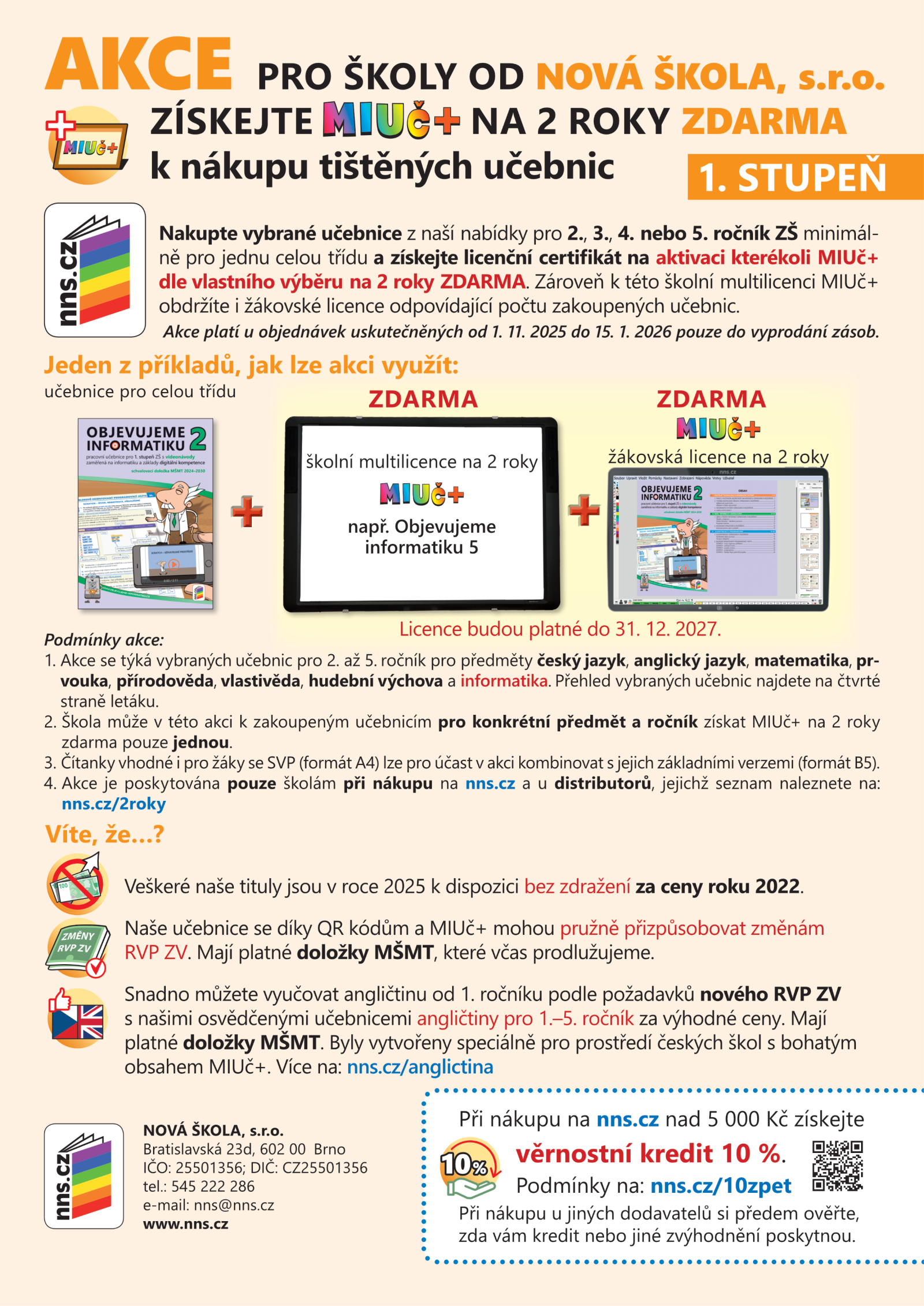 Od 1. 11. 2025 do 15. 1. 2026 od nás k nákupu vybraných učebnic z naší nabídky minimálně pro jednu celou třídu získáte licenční certifikát na aktivaci kterékoli multimediální interaktivní učebnice MIUč+ dle vlastního výběru na 2 roky zdarma pro školu i žáky. Podrobnosti v letáku.