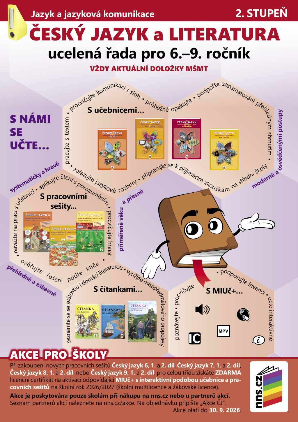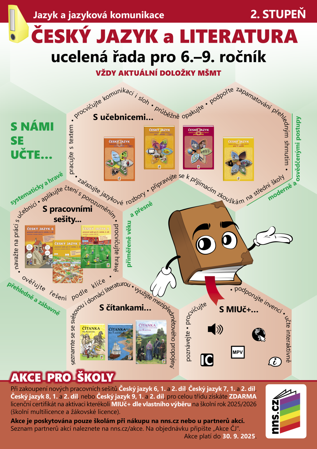 Ucelená řada učebnic, pracovních sešitů a MIUč+ českého jazyka pro 2. stupeň a odpovídající ročníky víceletého gymnázia zahrnuje učebnice Český jazyk 6, Český jazyk 7, Český jazyk 8 a Český jazyk 9. Jsou vytvořeny v souladu s RVP ZV a mají udělenou schvalovací doložku MŠMT. V koncepci učebnic klademe důraz na provázanost jednotlivých učebnic, splnění očekávaných výstupů, rozvíjení klíčových kompetencí a srozumitelnost při výkladu jednotlivých jazykových jevů.
