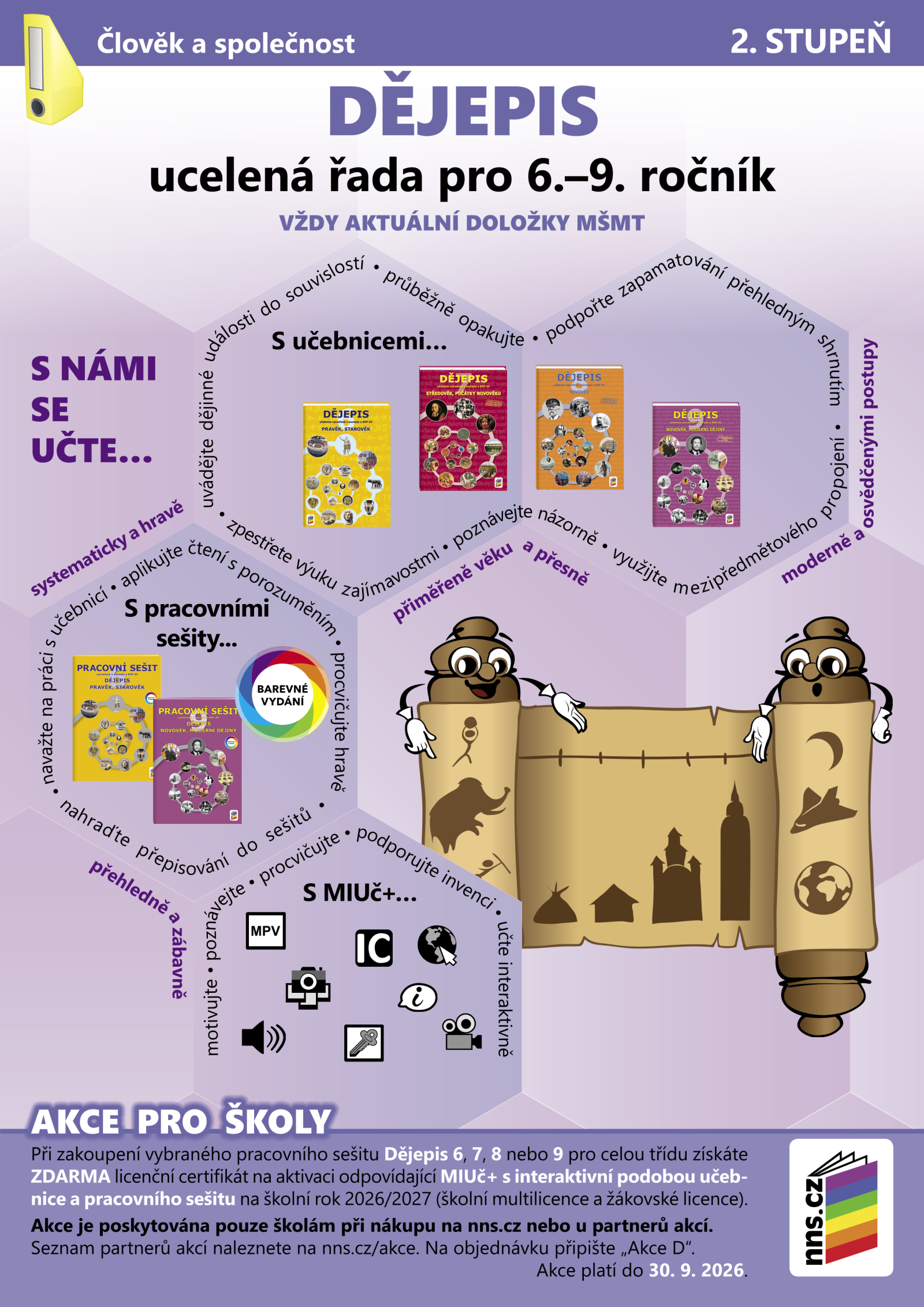 Ucelená řada učebnic a barevných pracovních sešitů a MIUč+ dějepisu je koncipována v souladu s RVP ZV. Učebnice mají platné schvalovací doložky MŠMT. Dějiny jsou žákům podány srozumitelným jazykem a v co nejjednodušší formě. V učebnicích není kladen důraz na osobnosti a data, ale na hledání příčin a souvislostí historických událostí i na každodenní život. Jednotlivé kapitoly obsahují také názorná schémata, mapy, fotografie a obrázky. Navíc zahrnují mezipředmětové vazby formou odkazů na korespondující učivo v ostatních učebnicích z řady, průřezová témata, skupinové úkoly, pojmy v angličtině a němčině, opakovací úkoly, zajímavosti, práci s internetem, práce s mapou, očekávané výstupy, klíčové kompetence a návrhy projektů. Připraveny jsou i pomůcky – časové přímky a mapy.