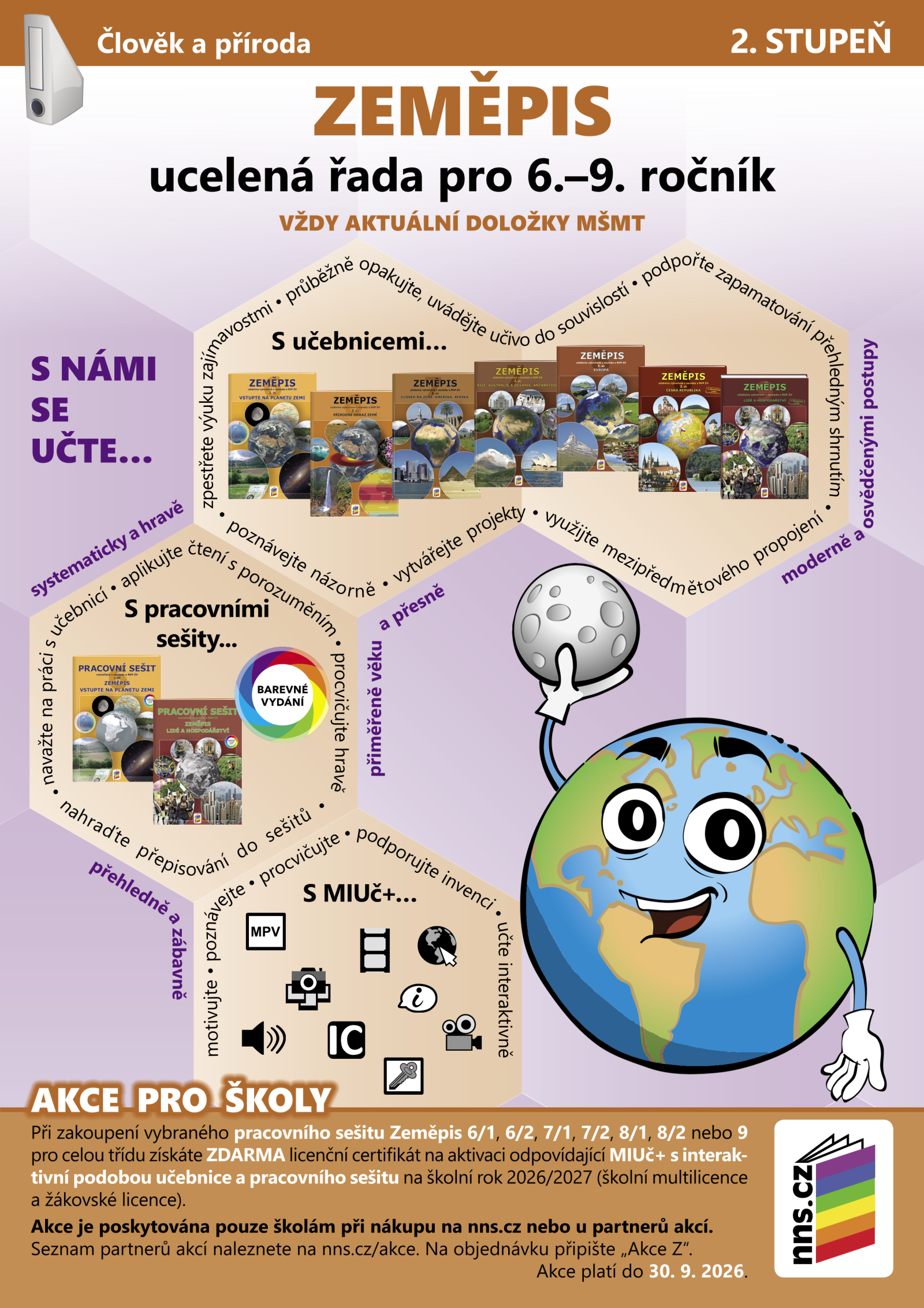 Vydáváme ucelenou řadu učebnic, pracovních sešitů a MIUč+ zeměpisu, které jsou koncipovány v souladu s RVP ZV. Učebnice mají platné schvalovací doložky MŠMT.Jednotlivé kapitoly obsahují také názorná schémata, mapy, fotografie a obrázky. Navíc zahrnují návrhy projektů.