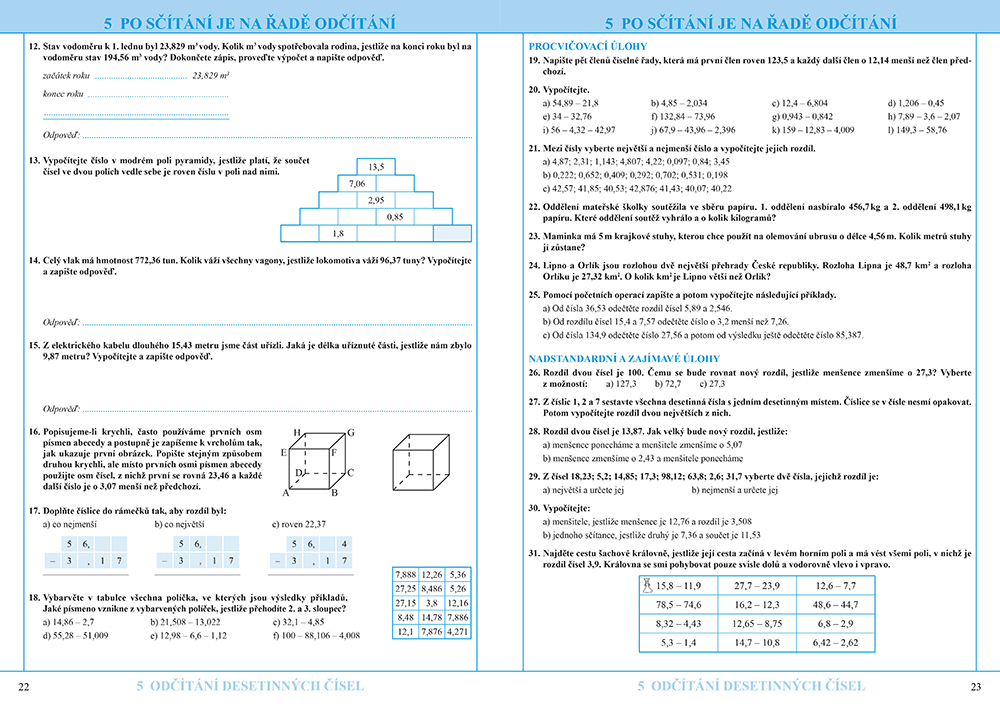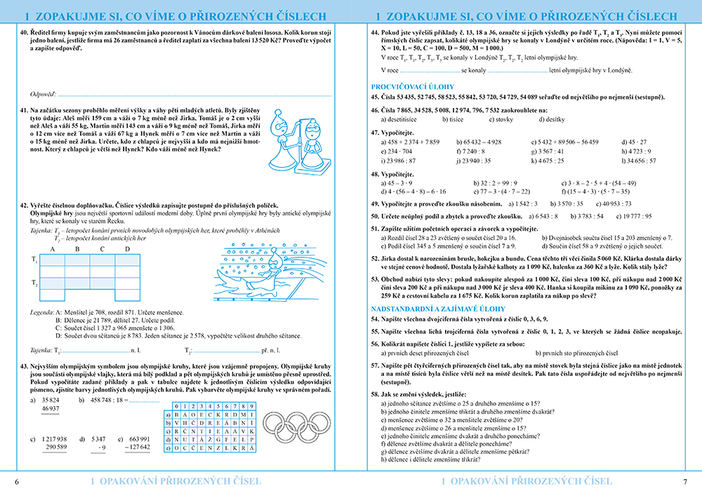 Nové dvoubarevní pracovní sešity formátu A4. V každém pracovním sešitě je zařazeno takové množství úloh, aby každý žák našel dostatek materiálu k procvičení látky – od velmi jednoduchých úloh až po úlohy standardní obtížnosti. Většina úloh je otevřených, najdete tu však i uzavřené úlohy s nabídkou odpovědí. Na závěr každé kapitoly jsou zařazeny další úlohy na procvičování, úlohy zajímavé a nadstandardní pro nadané žáky. Pro vytvoření mezipředmětových vazeb je pracovní sešit zaměřeny na vzdělávací oblast Člověk a zdraví.